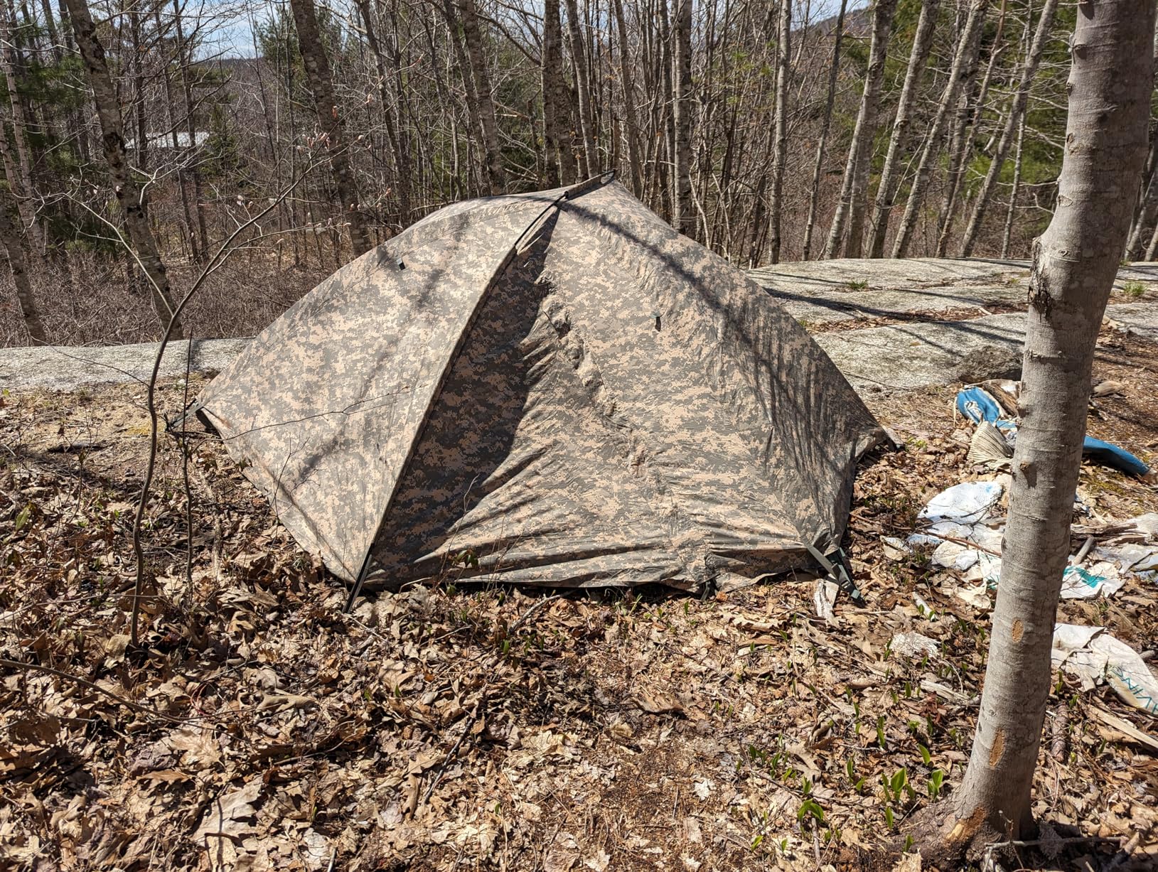 Surplus’s Improved Combat Shelter (96 x 40.5 x 32.5 in., 6.5 lbs) in used ACU features flame-resistant ripstop nylon, blackout rainfly, and waterproof tub floor. With aluminum poles, 7 stakes, and repair kit, it packs to 18 x 9 in. for solo camping. NSN: 8340-01-521-6438. 30-day guarantee.